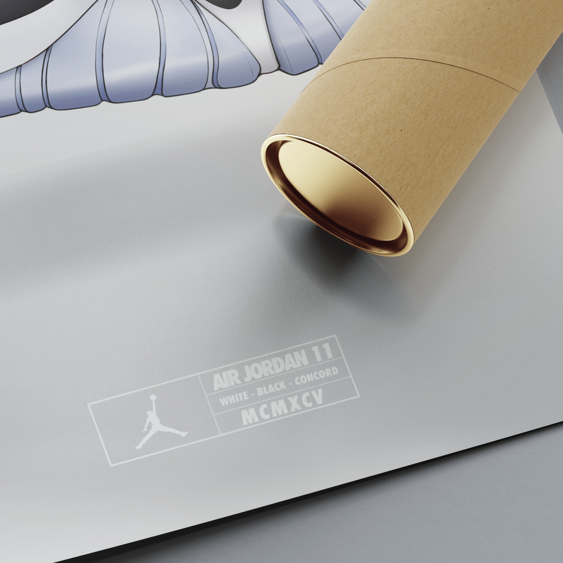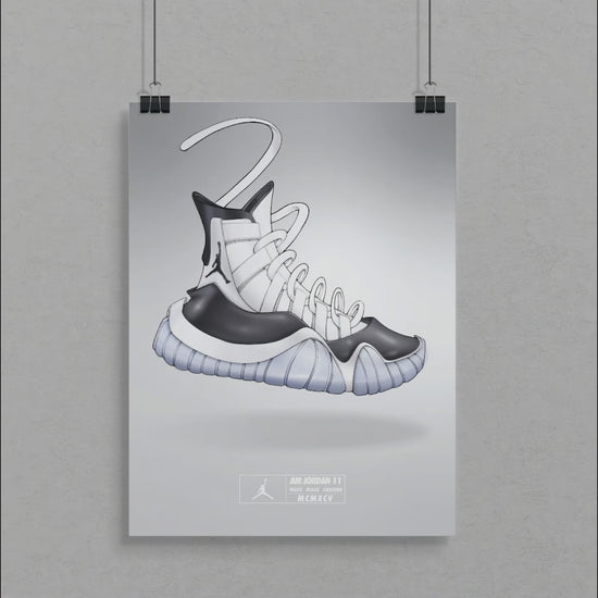 Tinker Hatfield watched video of Michael Jordan and noticed MJ's foot would roll off the foot bed on hard cuts. So Hatfield took that opportunity to blend substance with style, adding patent leather for the first time on a basketball shoe. Patent leather was stronger, and it fit MJ's reported desire to have a shoe that could be worn with a suit. Grab a print of one of the greatest shoes of all time. Available while supplies last.