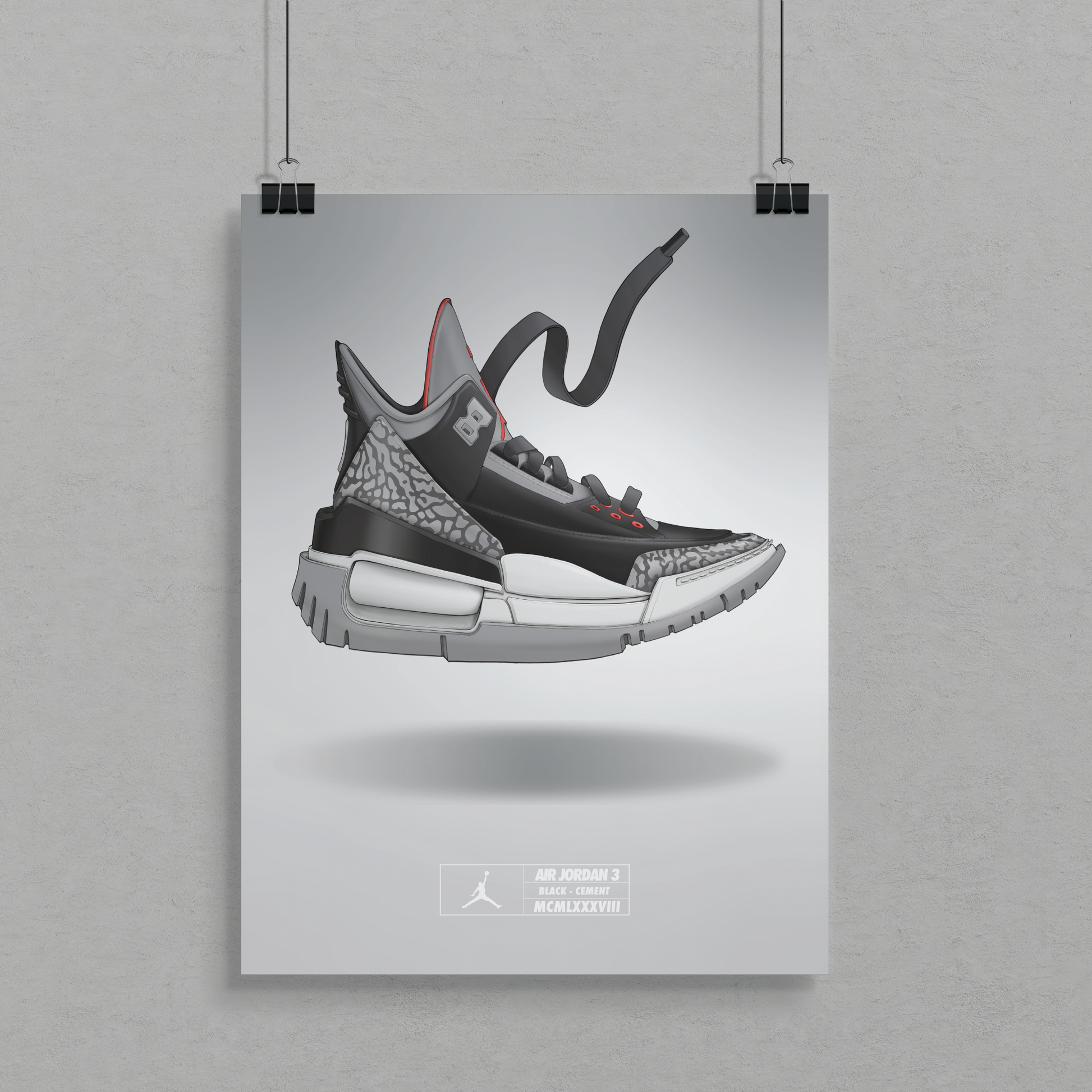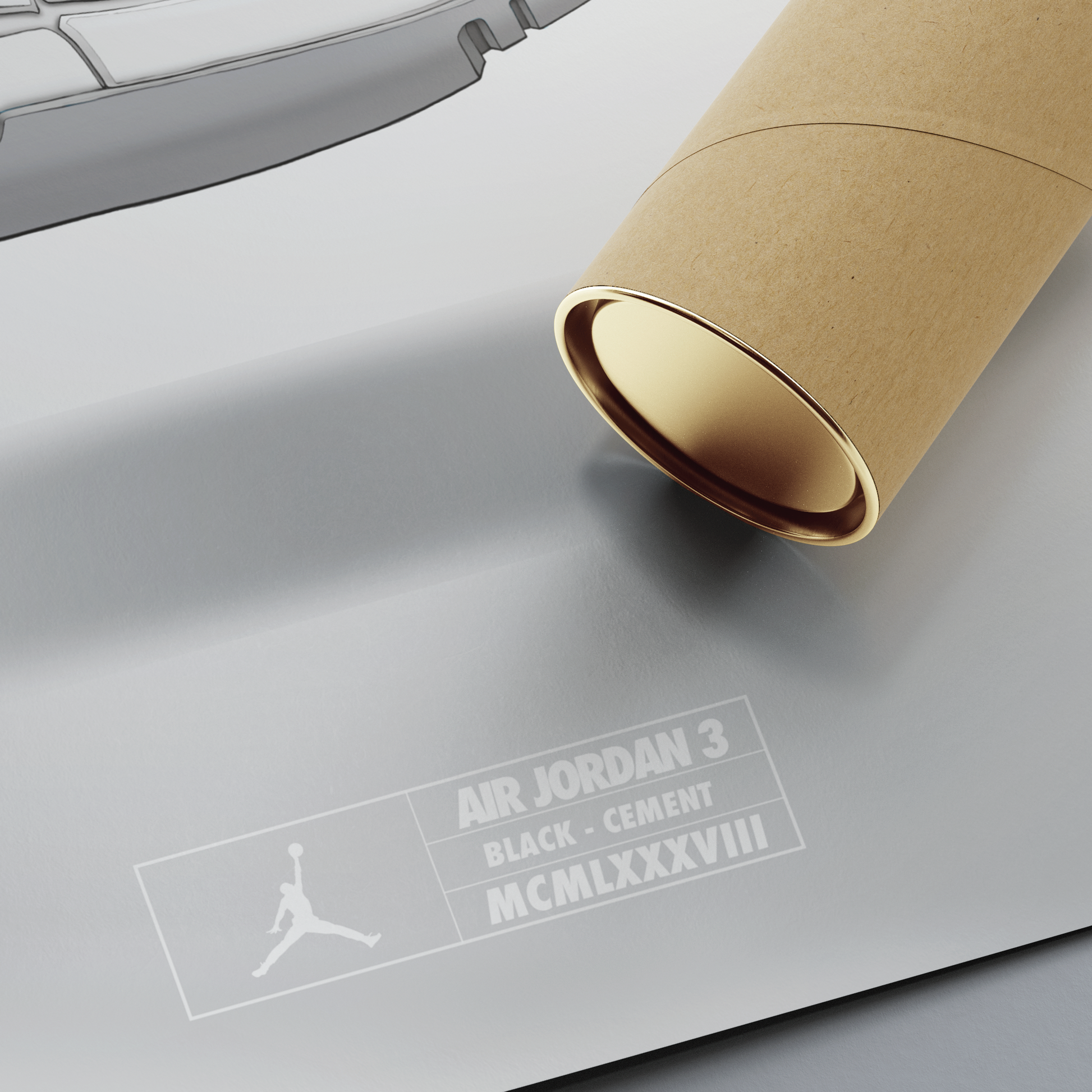 When the Air Jordan 3 was released in 1988, it was the first Air Jordan to feature the elephant print, visible Air Unit and Jumpman logo, and was MJ’s first signature shoe designed by Tinker Hatfield. This print honors the iconic ‘Black Cement’ colorway boasting the same trademark details—like the black tumbled leather upper—we all remember fondly. Celebrate this legendary model ,and grab a print while supplies last!