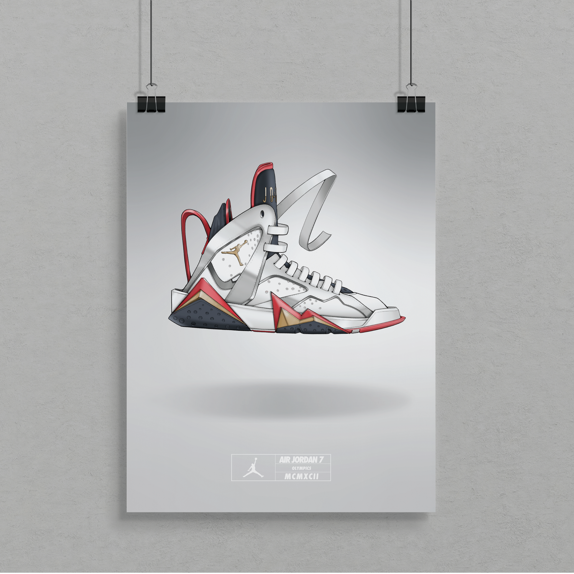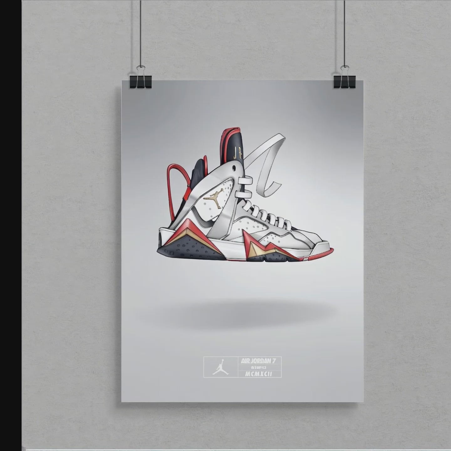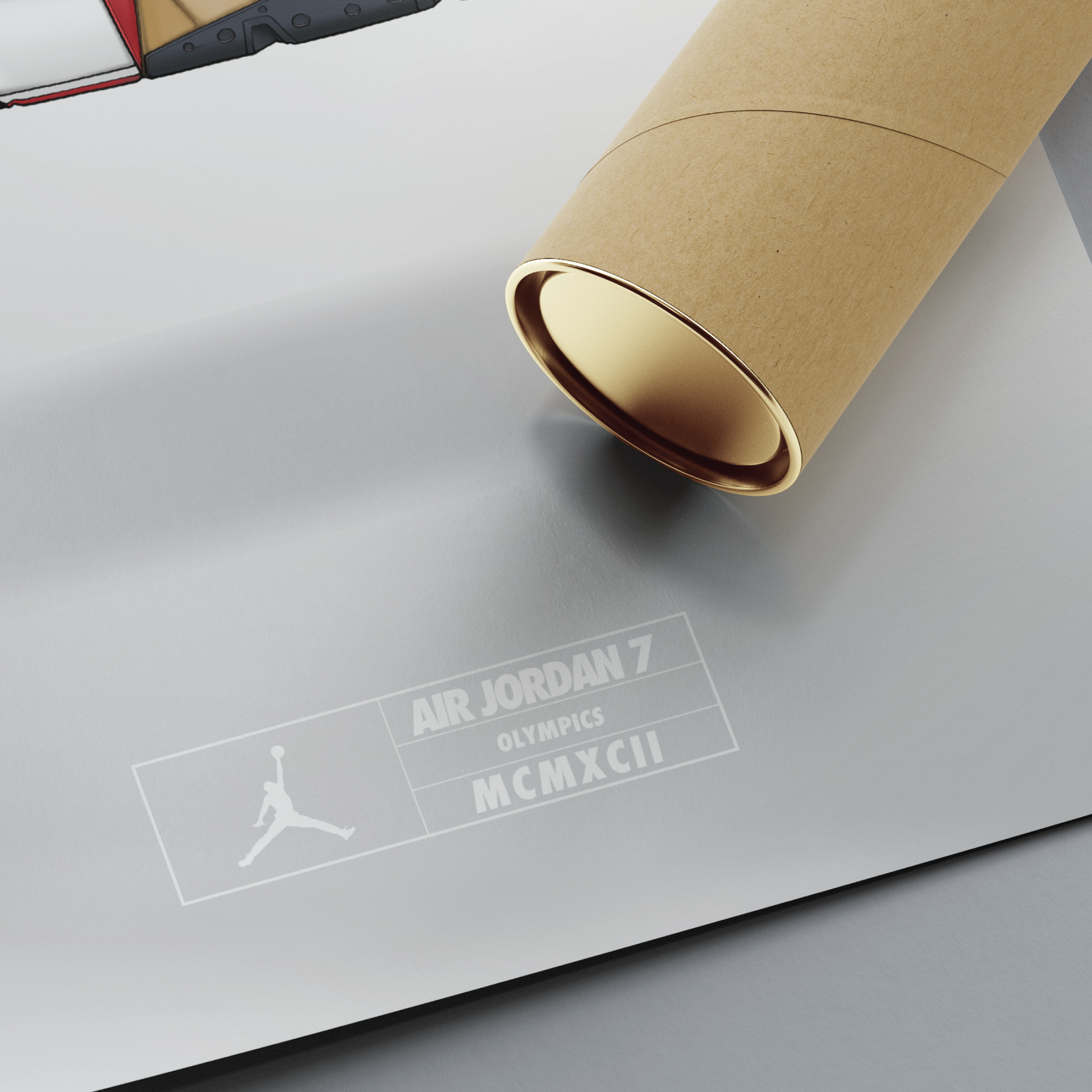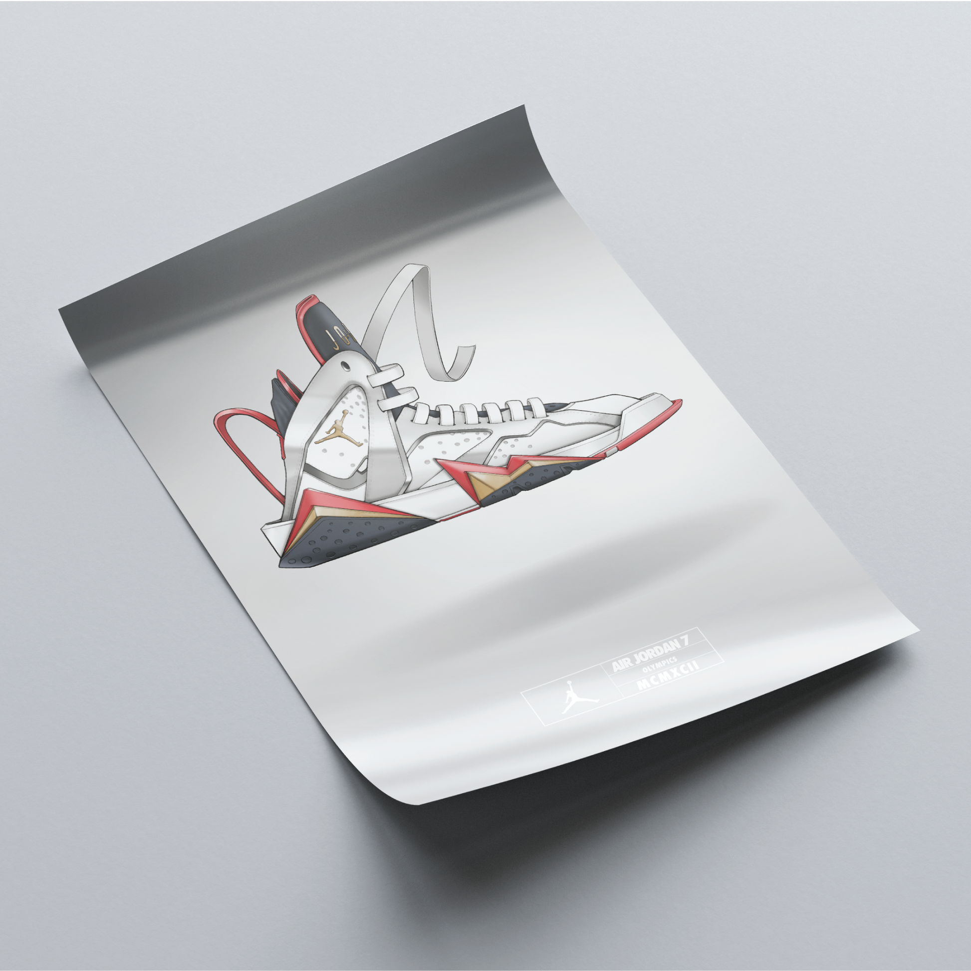 The Air Jordan 7 'Olympic' was released in the 1992 Olympic Games on the way to a gold medal with the Dream Team. The design features an upper white and metal silver with accents from Obsidian, metallic gold, and True Red. Celebrate this historic win and grab a print while supplies last.